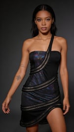 This standout piece combines sleek black poly/spandex panels with iridescent holographic reflective inserts that explode into rainbow oil-slick gleams under lights, dramatically bound by hand-woven LDPE plastic yarn straps that spiral and cage the silhouette for an edgy, bondage-inspired edge. The asymmetric one-shoulder design, bodycon fit, and mini length create a fierce, curve-hugging armor that's equal parts futuristic goth and nightlife domination.