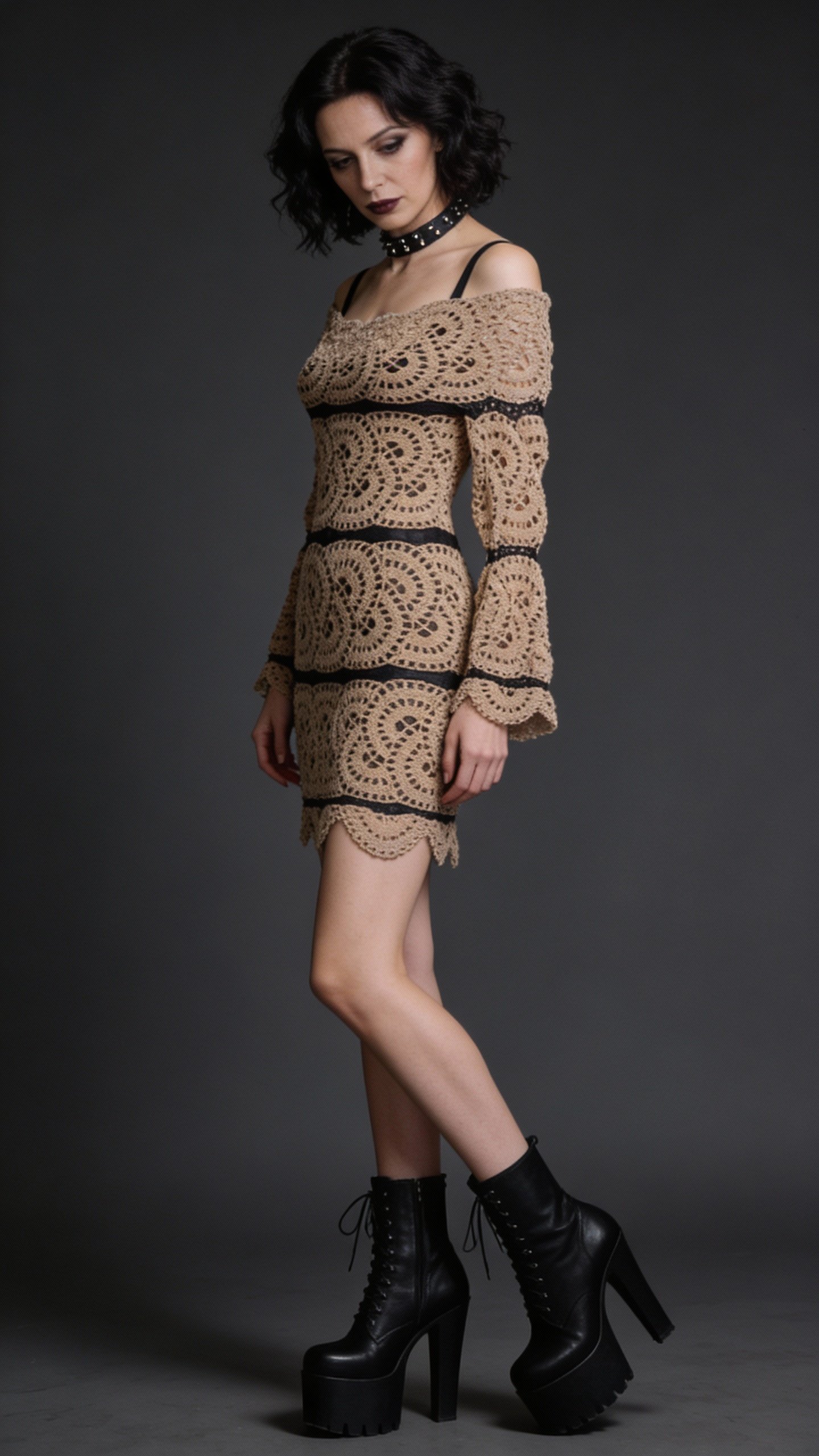 Hand crocheted from a soft polyester/cotton blend, this off-shoulder piece drapes like a second skin—equal parts vulnerability and defiance. Wear it over slips, dresses, or bare intention. Romantic, unsettling, and unapologetically dark, this is not a dress for blending in—it’s for becoming something else.