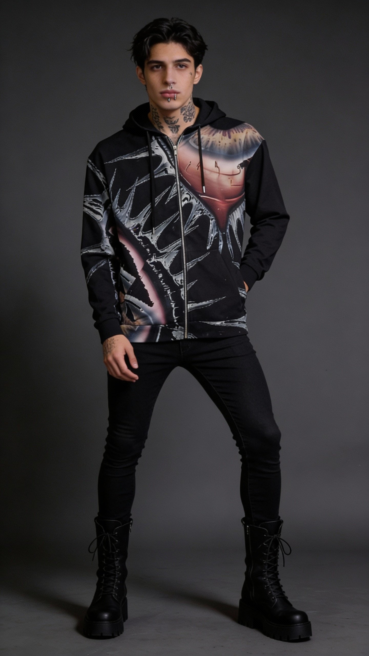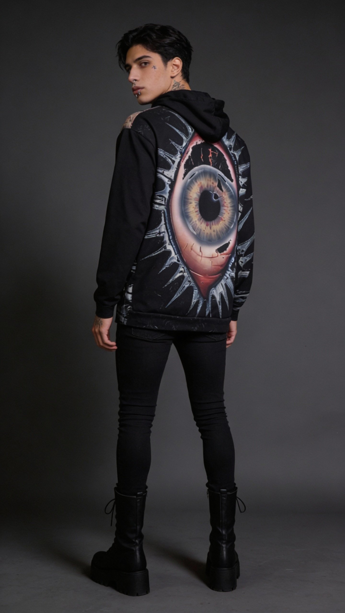 This full-zip hoodie features our signature hyper-detailed All-Seeing Eye graphic exploding across the front in bleeding, thorn-crowned glory, with cracked, radiating spikes that wrap the shoulders and a massive, unblinking eye dominating the back.