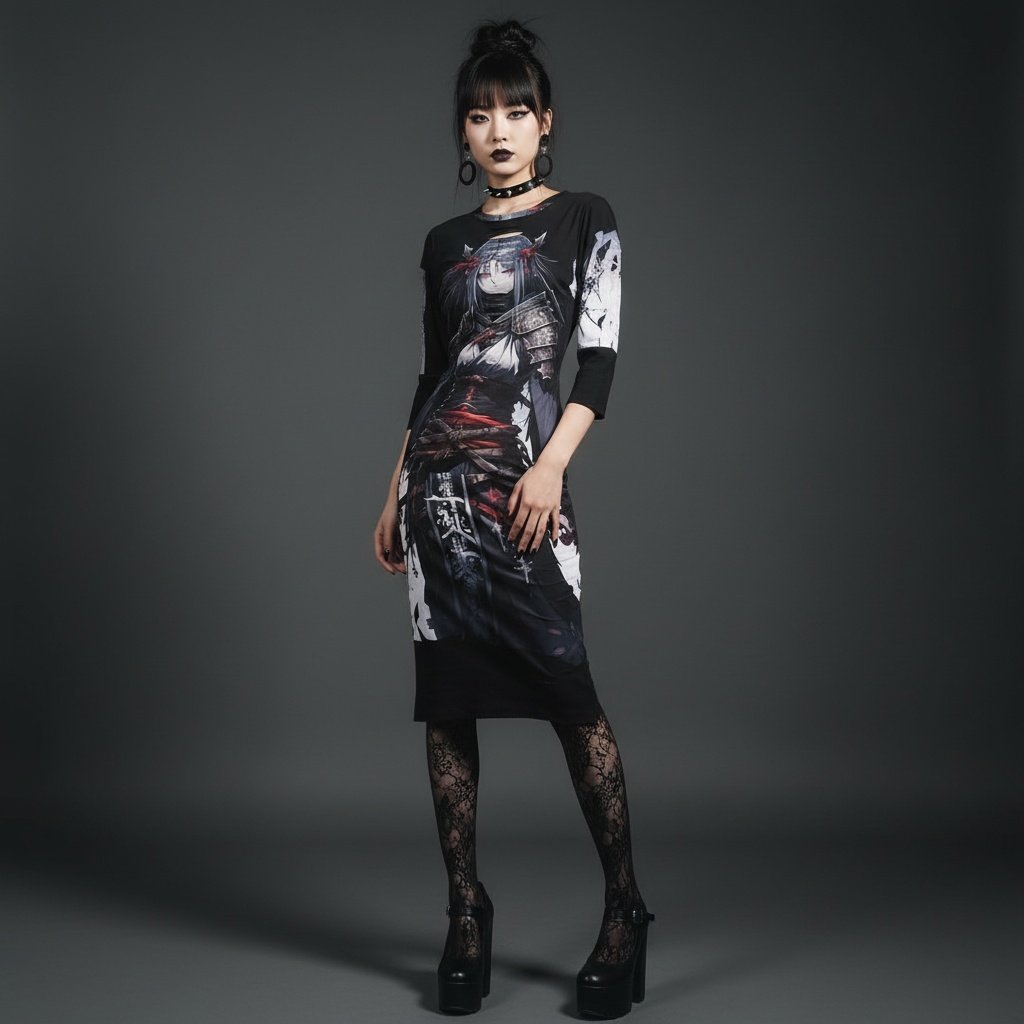 Slip into the void. Our custom Shinobi print – midnight black with blood-red kanji and stealth blades – wraps a buttery polyester-spandex stretch bodycon mini that moves like smoke and hugs like a curse. High neck, long sleeves, thigh-grazing length. Perfect for disappearing into the crowd… or making sure no one can look away. Only 20 made.