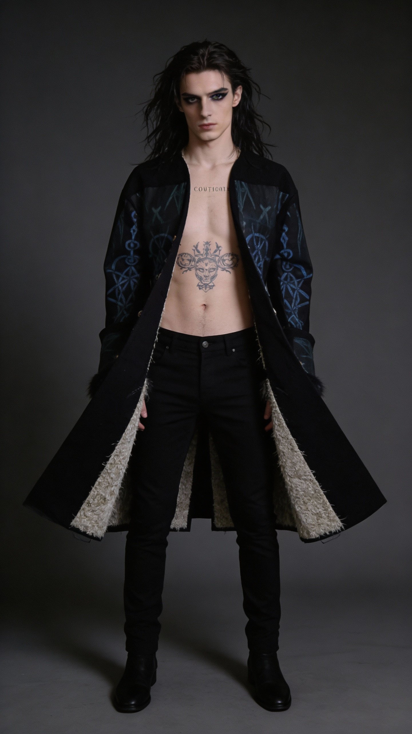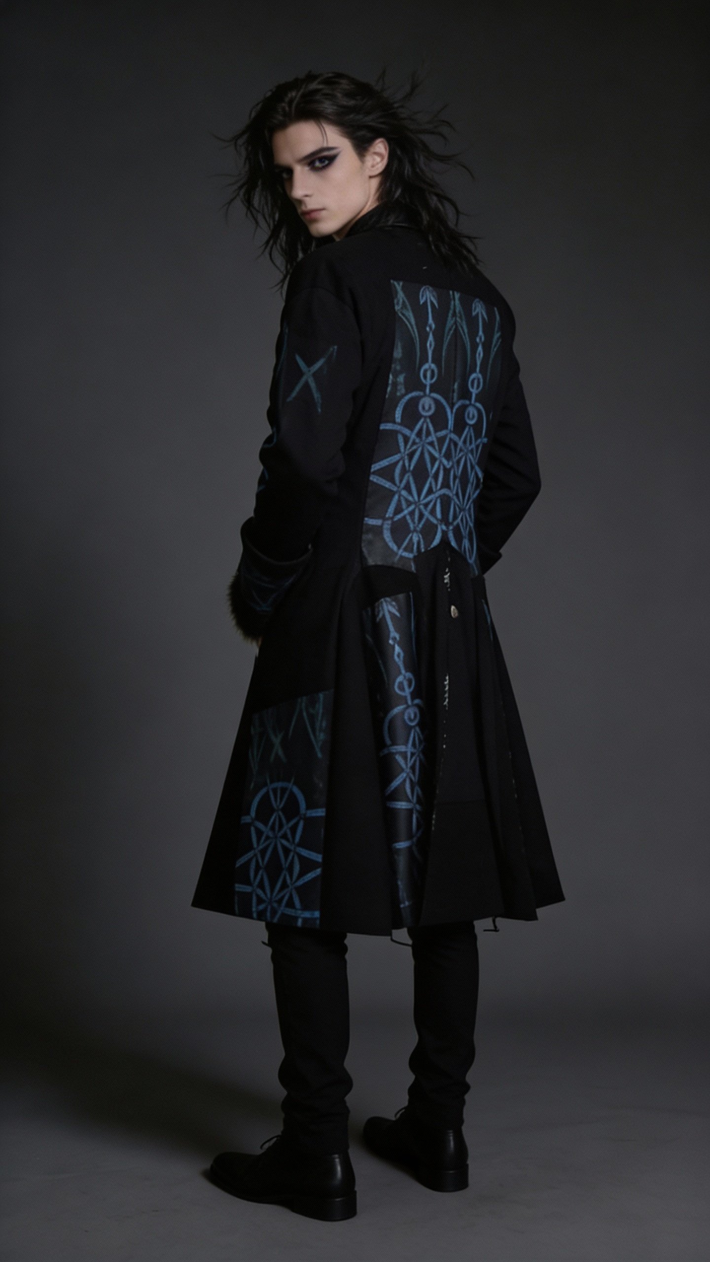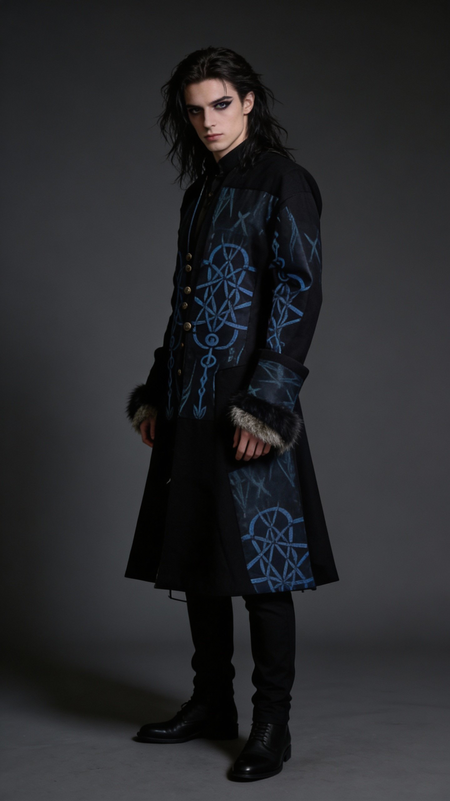 This commanding long duster coat merges intricate Celtic knotwork and spiral motifs (interwoven chains, endless loops of dread, and radiating abyssal symbols) dominate the front, back, and sleeves in glowing azure against midnight black, evoking the Fomorians' eternal war on cosmic order. Luxe inner cuffs add a primal, monstrous edge, while the dramatic high collar, button-front closure, and flowing asymmetrical hem deliver that signature Snarkeez silhouette — equal parts ancient raider and apocalyptic sovereign.